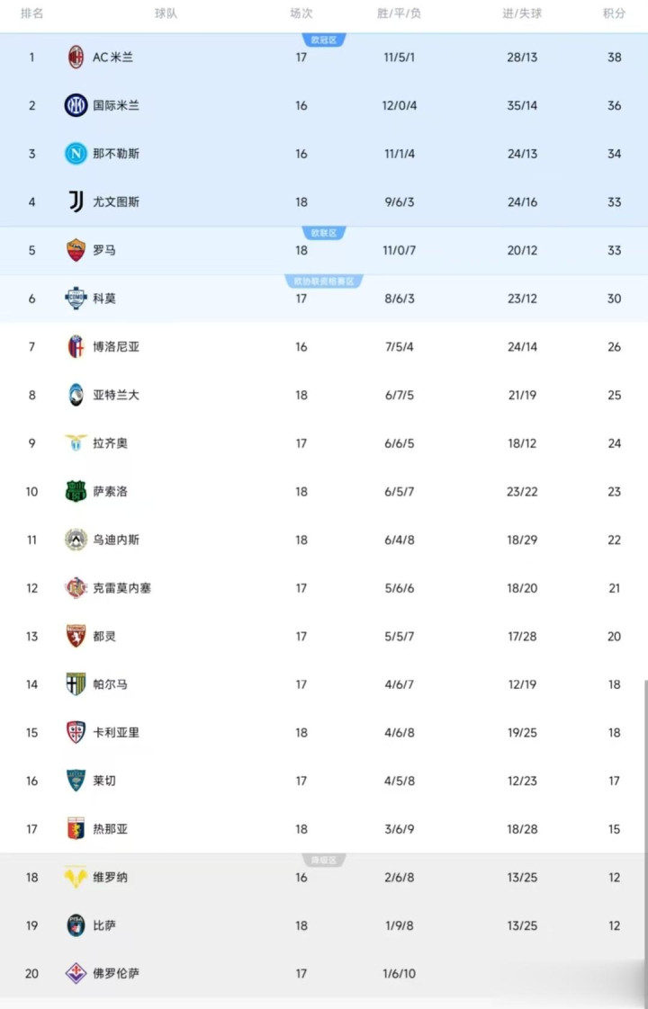 意甲最新积分榜如下
